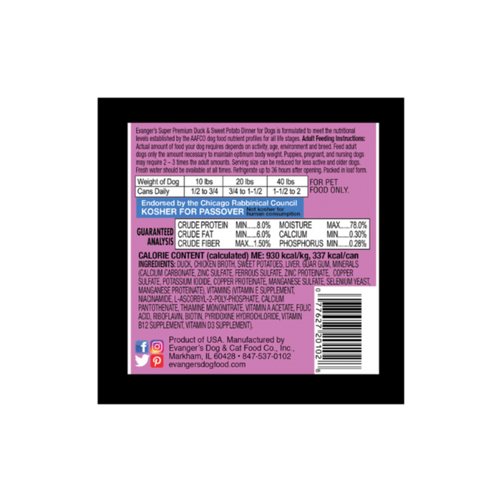 Give your dog the premium protein they crave with Evanger's Duck & Sweet Potato Dinner. This delicious canned formula features real duck as the first ingredient, complemented by nutritious sweet potatoes for a balanced, flavorful meal that dogs absolutely love.