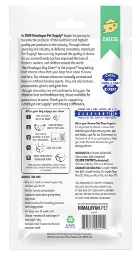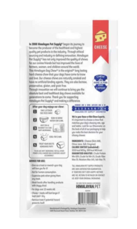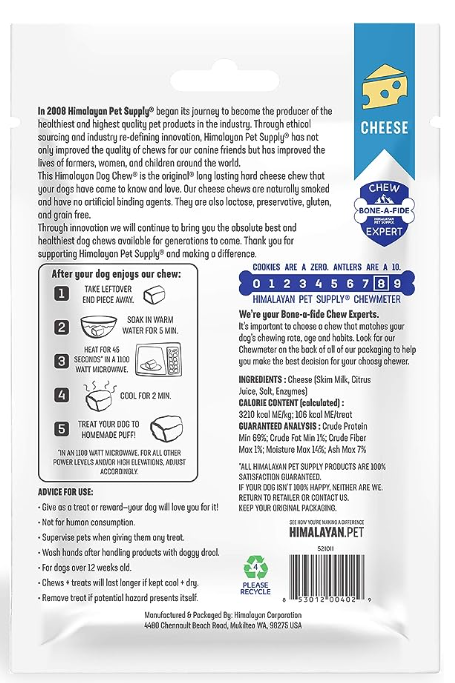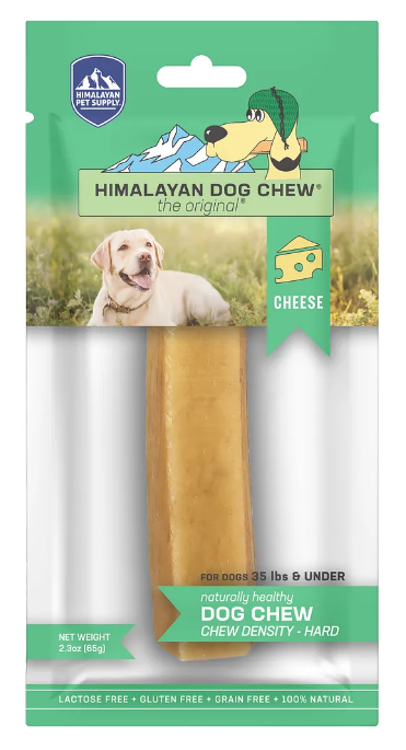 Himalayan Dog Chew® is the original® long-lasting, hard smoked cheese chew registering an 8 on our Chewmeter. It was created from an ancient recipe and made using traditional methods with yak and/or cow milk. Dogs must work the end of the treat for hours, softening it with their mouths before small parts of it can be slowly chewed off.