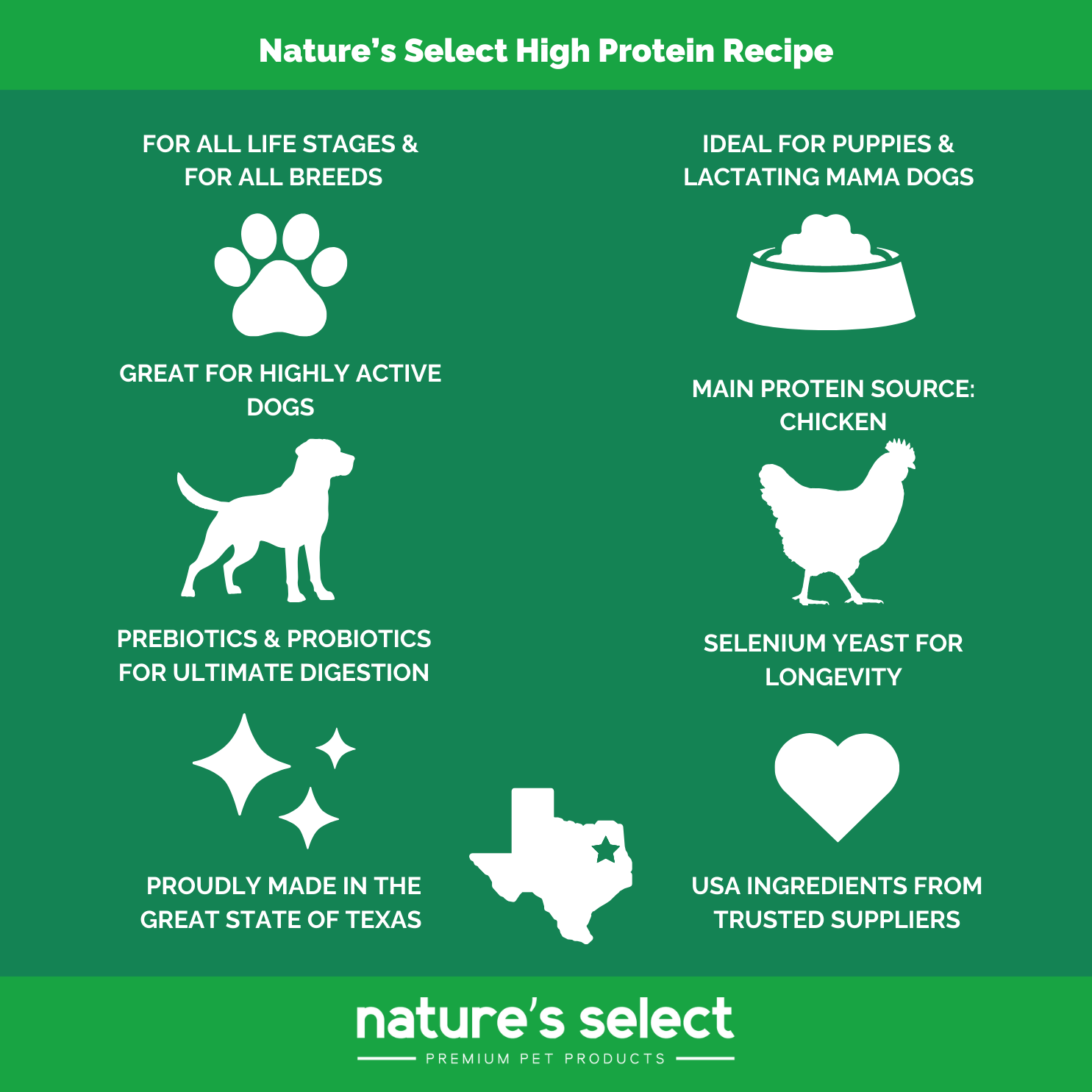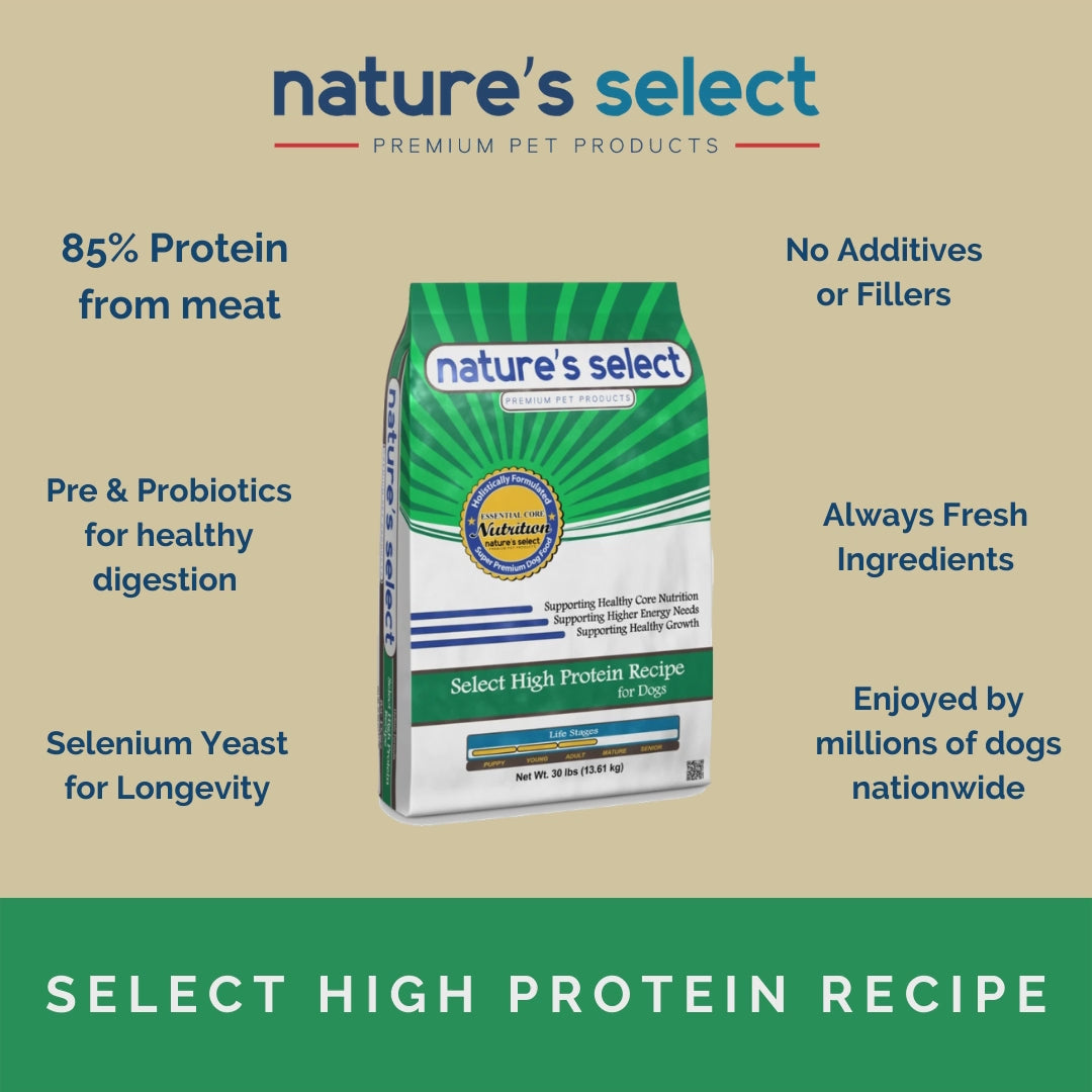 Nutritional Adequacy Statement Nature's Select, Select High Protein Recipe for Dogs is formulated to meet the nutritional levels established by the AAFCO Dog Food Nutrient Profiles for All Life Stages, including growth of large size dogs (70 lbs. or more as an adult)